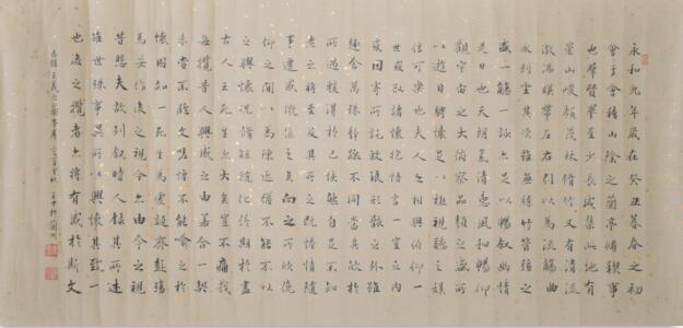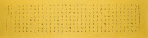 王中先生的书法表现出那些净化了的禅心,也实施流露出情感的波痕。禅的潜修与艺术的养心使其作品达到一种超脱的状态,澄澈明透,无拘无束,又让人感到“有象可执”的影子在徘徊,故其书,显得恬静、冲淡之至。观其书,字体工整,使人联想到茶禅一味。今人书经,任意潦草,非为书经,乃以藉此习字,急功近利之心跃然纸上矣。书经须字体工整严谨,不得有半点潦草,诚心诚意,不能有杂尘之想,他的书经是一种高度净化了的纸条和高旷的意境,不仅在当今书林独树一帜,起到无与伦比的鉴照作用,而且是他人生与禅味的综合写真,其作品把人生、艺术、禅意有机地统一在一起,显得那么自然,那么和谐,反映出他为人充实执着,禅修恭敬至诚,治书勤谨投入的性格。